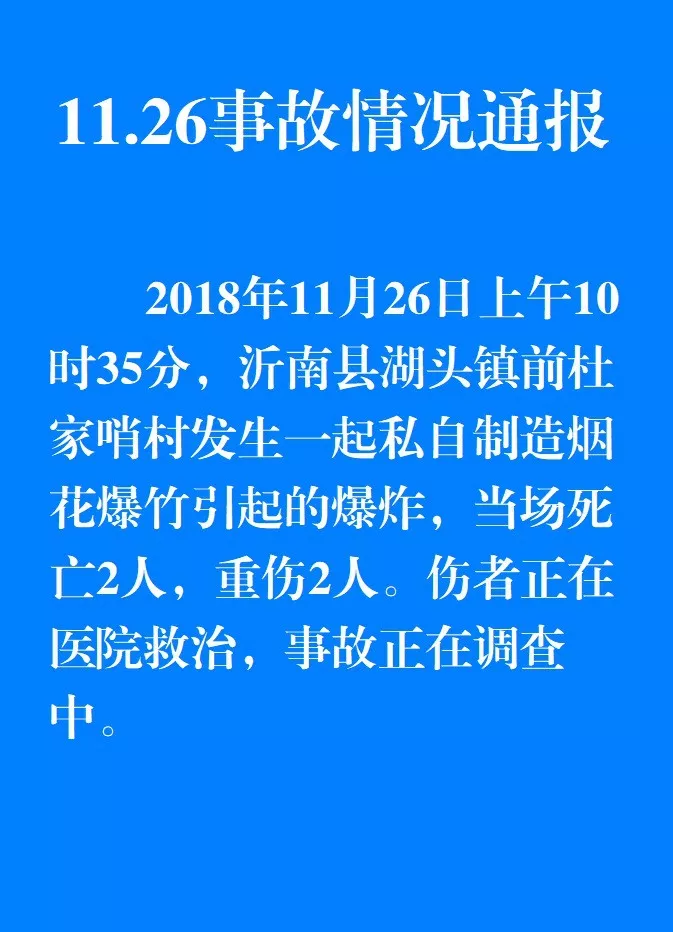 新京报快讯 据沂南县委宣传部官方微信消息,2018年11月26日上午10时35分,沂南县湖头镇前杜家哨村发生一起私自制造烟花爆竹引起的爆炸,当场死亡2人,重伤2人。伤者正在医院救治,事故正在调查中。
