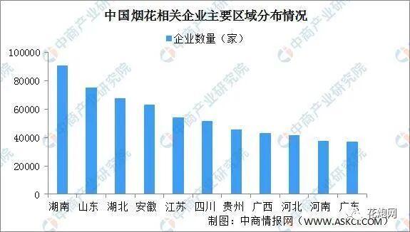 据企查查数据,烟花相关企业烟花870406家,主要集中在湖南、山东、湖北、安徽、江苏、四川等地。其中,湖南烟花相关企业最多超9万家。据悉,湖南长沙的浏阳市、株洲的醴陵市入选四大烟花爆竹基地。浏阳是最早被称为“花炮之乡"的县市,素有“浏阳花炮震天下”的美名。醴陵市盛产花炮,是花炮祖师李畋故里,是“中国花炮之都”。