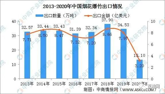 星辰日月高天际,雪散烟花遍海隅。烟花绽放于海上天地之间,点点星火弥散出火树银花的浪漫。中国是烟花创始国,烟花出口大国。据海关总署数据,2013年以来,中国烟花、爆竹出口量在30万吨以上,出口金额在7-8亿美元区间上下浮动。2018年中国烟花爆竹出口规模达到顶峰,出口量37.90万吨,出口金额8.66亿美元。2019年全球贸易低迷不振,烟花出口规模有所缩小,今年以来,受疫情影响,烟花出口形势严峻,烟花爆竹出口量13.10万吨,同比减少26.1%,出口金额3.20亿元,同比减少22.3%。当前,出口遭遇困境,烟花爆竹企业纷纷转内销。