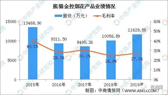 中国是烟花的故乡,燃放烟花历史源远流长,既是传统、又是一种民俗文化,将传统文化发扬光大,以烟花传情,以焰火达意,赋予新的内涵。中国人口众多,烟花文化浓厚,烟花市场大。目前暂未有明确的烟花市场规模相关的数据,但是可以通过烟花上市公司熊猫金控经营数据管中窥豹。2019年熊猫金控烟花产品1.16亿元,同比增长15.64%。毛利率27.2%,比上年增加2.28个百分点。查看历史数据,受环保政策影响,近几年熊猫金控烟花产品营收略有下降,毛利率也呈现下降的趋势。
